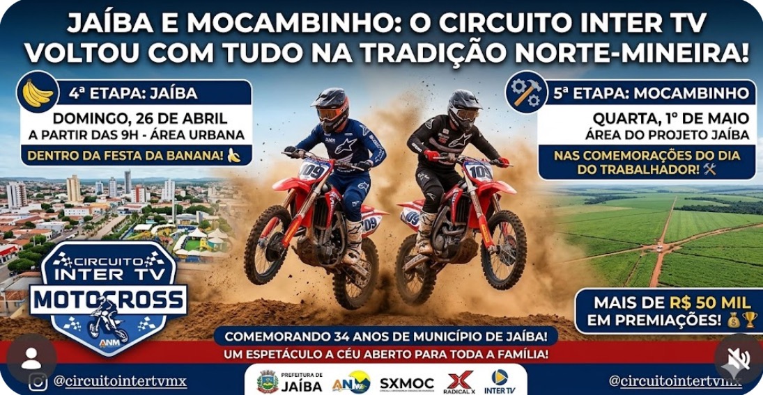 Prepara o capacete e segura a ansiedade, porque a poeira vai subir alto! A tradição do motocross norte-mineiro tá de volta com tudo e o palco da adrenalina desta vez é a nossa querida Jaíba. Pode anotar na agenda: o município vai receber não uma, mas duas etapas do Circuito InterTV. É velocidade pura, manobra radical e aquela emoção que só quem é daqui entende!